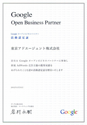 東京アドエージェント株式会社(本社:東京都中央区、代表取締役社長:筒井輝夫)は、グーグル株式会社より活動認定証を受彰致しました。 今回の活動認定証は、Googleオープンビジネスパートナーに参加し、Google Adwordsの新規広告主獲得に際して実績を認めて頂いた結果です。