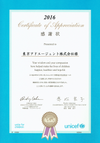 東京アドエージェント株式会社(本社:東京都中央区、代表取締役社長:筒井輝夫)は、財団法人日本ユニセフ協会より感謝状を受彰致しました。
